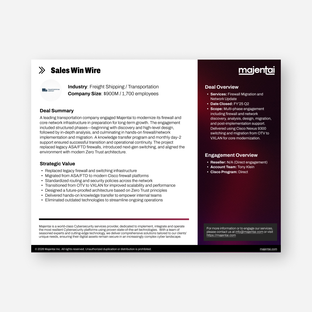 A leading transportation company engaged Majentai to modernize its firewall and core network infrastructure in preparation for long-term growth.