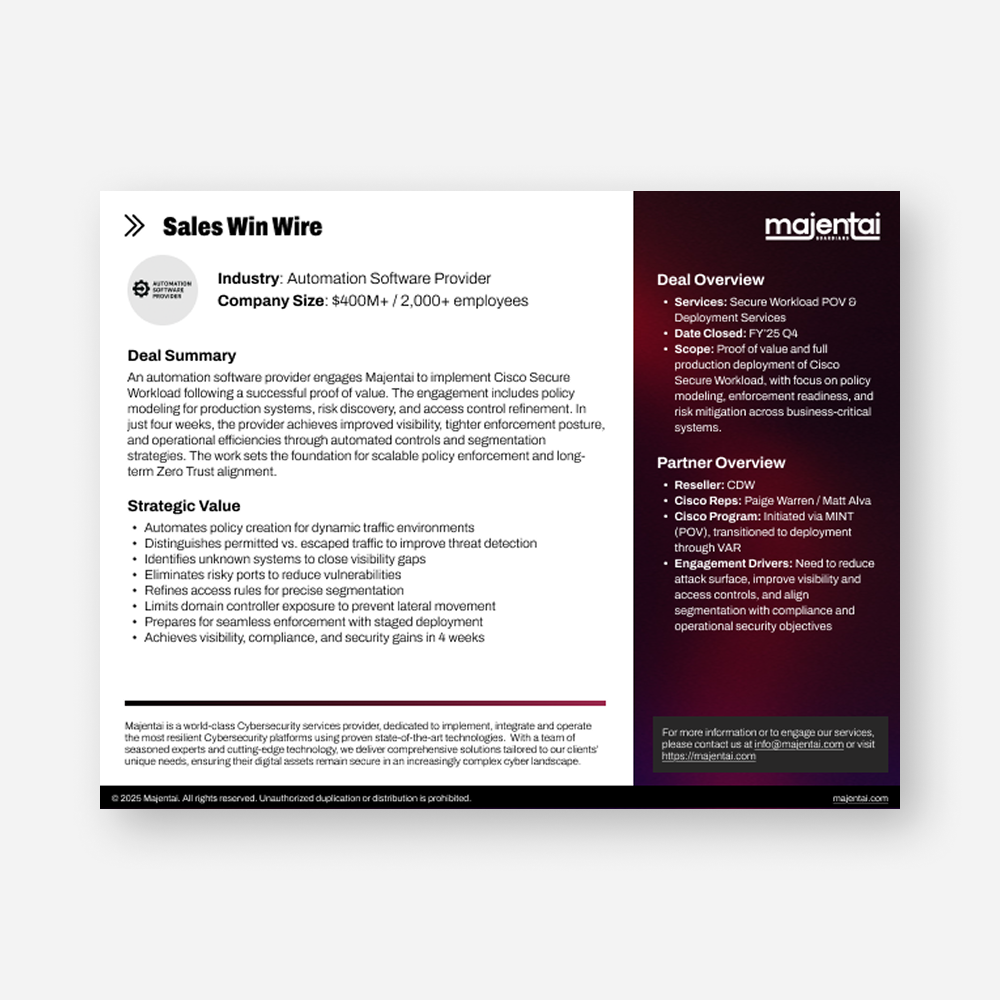 Understanding what exists is only the beginning. Controlling it is what builds resilience. Magentai’s Segmentation Workshop helps teams move from visibility to action using Zero Trust principles to protect critical assets without disrupting the business.