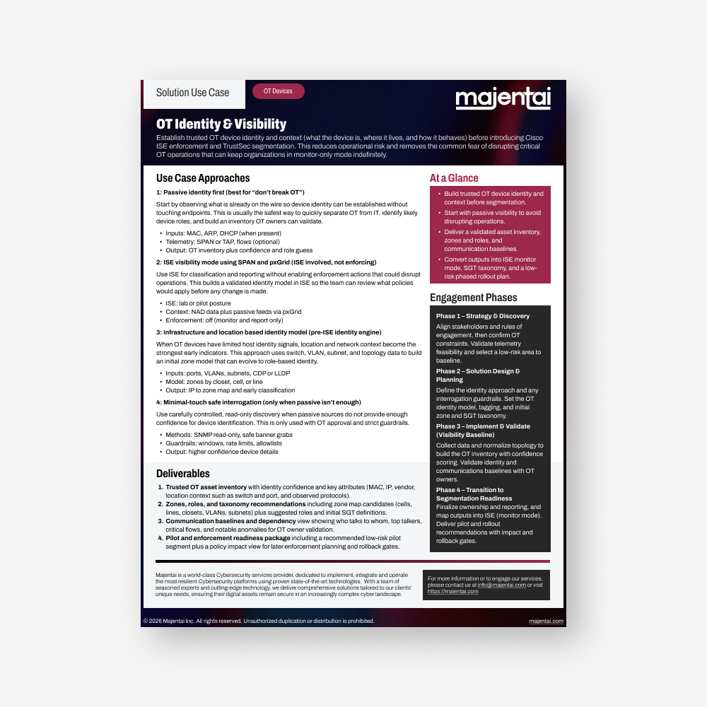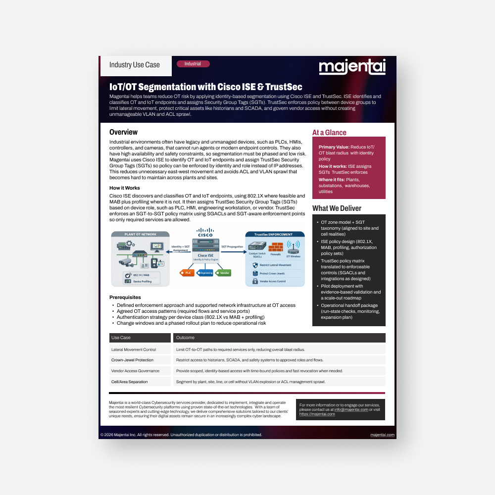 Magentai helps teams reduce OT risk by applying identity-based segmentation using Cisco ISE and TrustSec. ISE identifies and classifies OT and IoT endpoints and assigns Security Group Tags (SGTs). TrustSec enforces policy between device groups to limit lateral movement, protect critical assets like historians and SCADA, and govern vendor access without creating unmanageable VLAN and ACL sprawl.