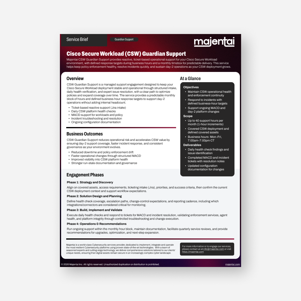 Majentai CSW Guardian Support provides reactive, ticket-based operational support for your Cisco Secure Workload environment, with defined response targets during business hours and a monthly timebox for predictable delivery. This service helps keep policy enforcement healthy, resolve incidents quickly, and sustain day-2 operations as your CSW deployment grows.