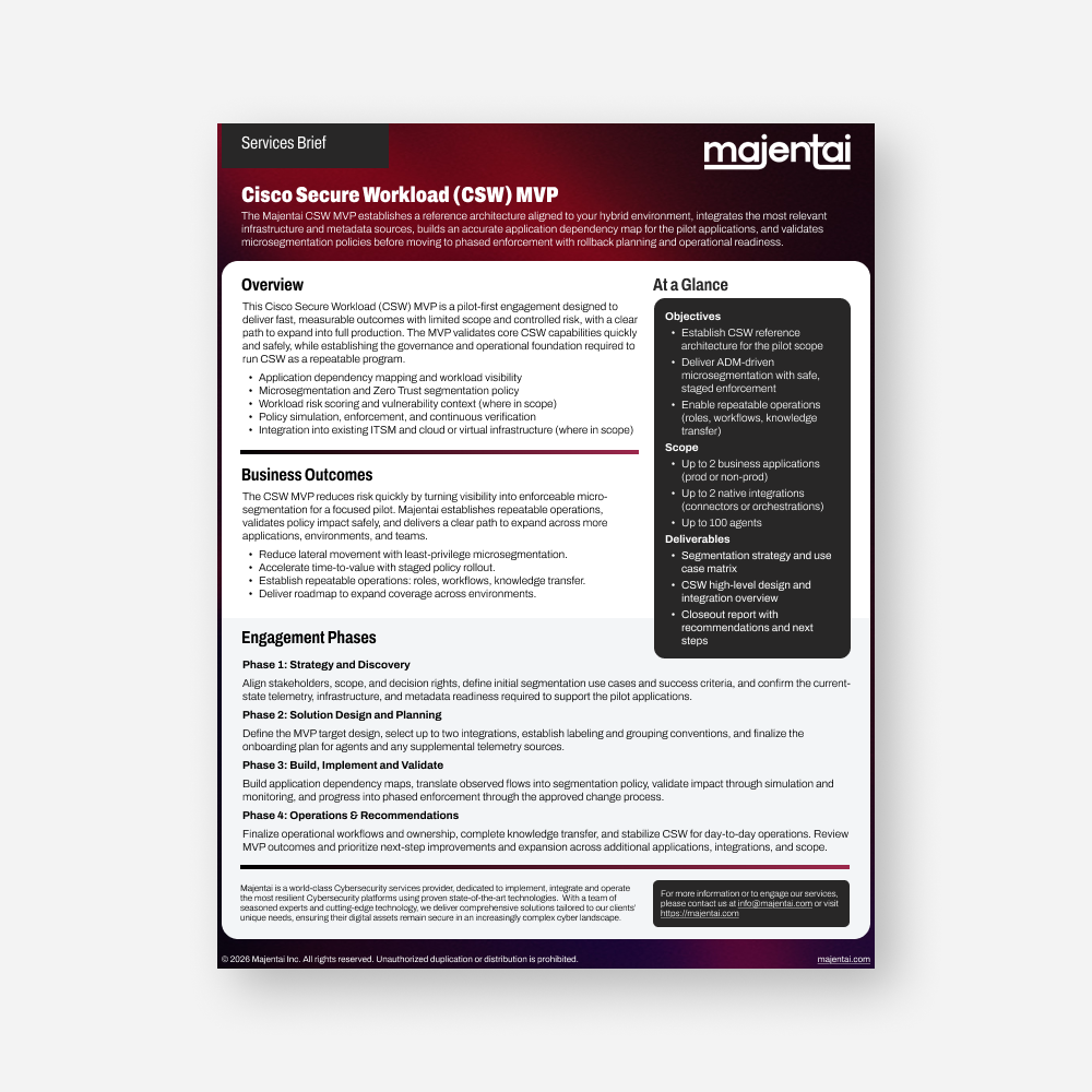 Cisco Secure Workload (CSW) Implementation is a greenfield CSW engagement for dependency mapping, workload visibility, and Zero Trust microsegmentation. Majentai aligns stakeholders, integrates data sources, builds the dependency map, and moves policies from simulation to enforcement with operational handoff.